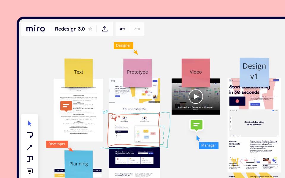 Pros: Love the tools available overall. So easy to get started on a design project and collaboration is slick and painless. Also a little detail i like is that when you paste a link onto a board it appears as a little window instead of just a messy link, really nice little detail.