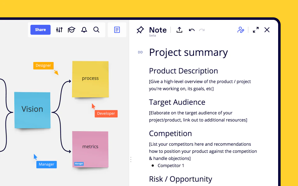 Pros: Miro is very easy to access and collaborating on whiteboard with my colleague is so simple as it get. We have a online brainstorming session on the whiteboard, and everyone can pitch on idea and start adding draw it into the board in real-time.