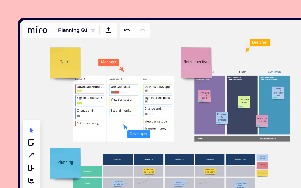 Miro is the online collaborative whiteboard platform that enables teams work effectively together, from brainstorming with digital sticky notes to planning and managing agile workflows.